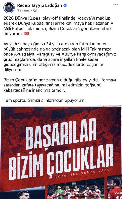 Türkiyə Prezidenti Rəcəb Tayyib Ərdoğan ölkə milli futbol komandasını DÇ-2026-nın final mərhəlısinə yüksəlməsi münasibəti ilə təbrik edib.O, sosial mediadakı paylaşında bunları qeyd edib: