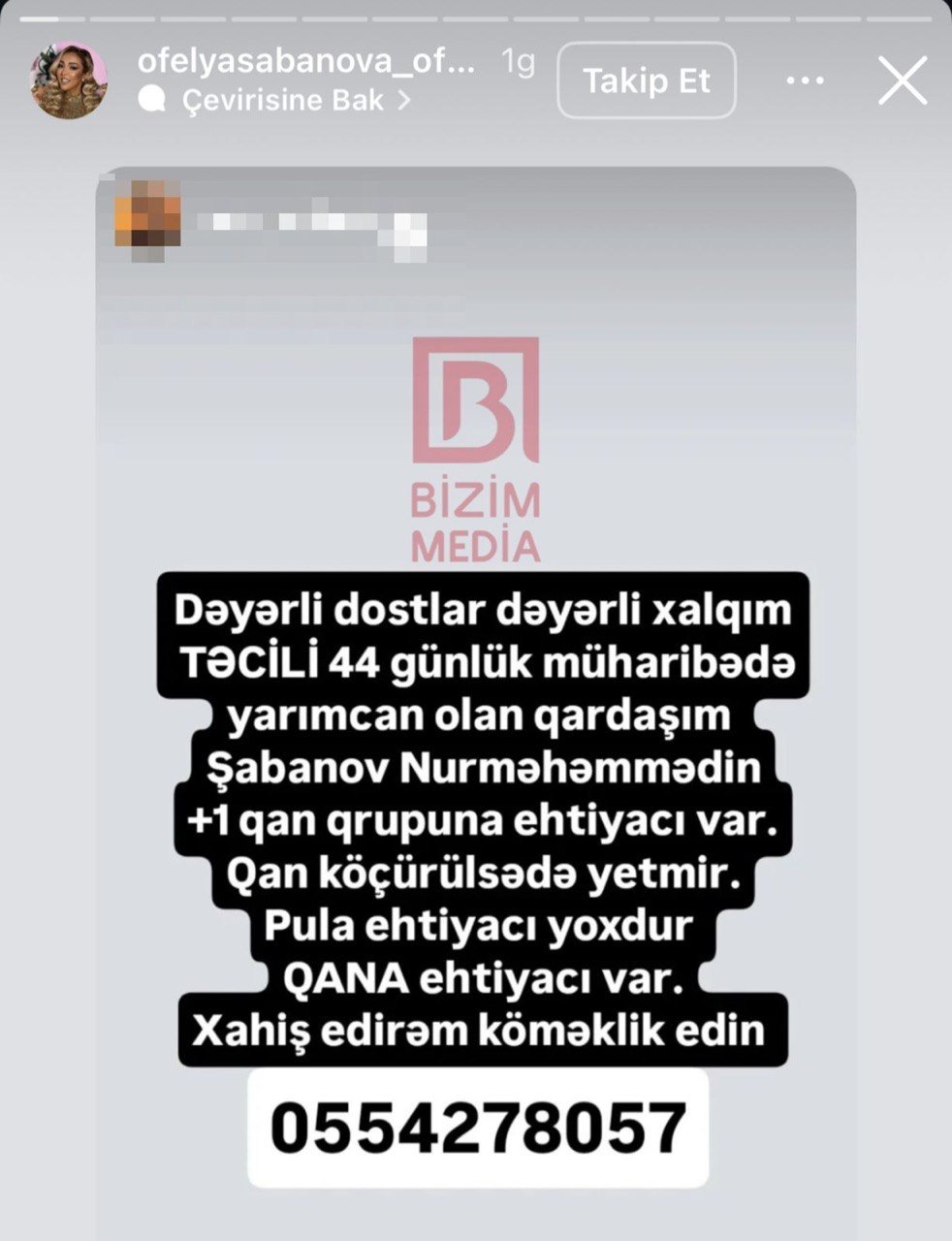 Ofelya qardaşı üçün təcili qan axtardıqlarını bildirib.