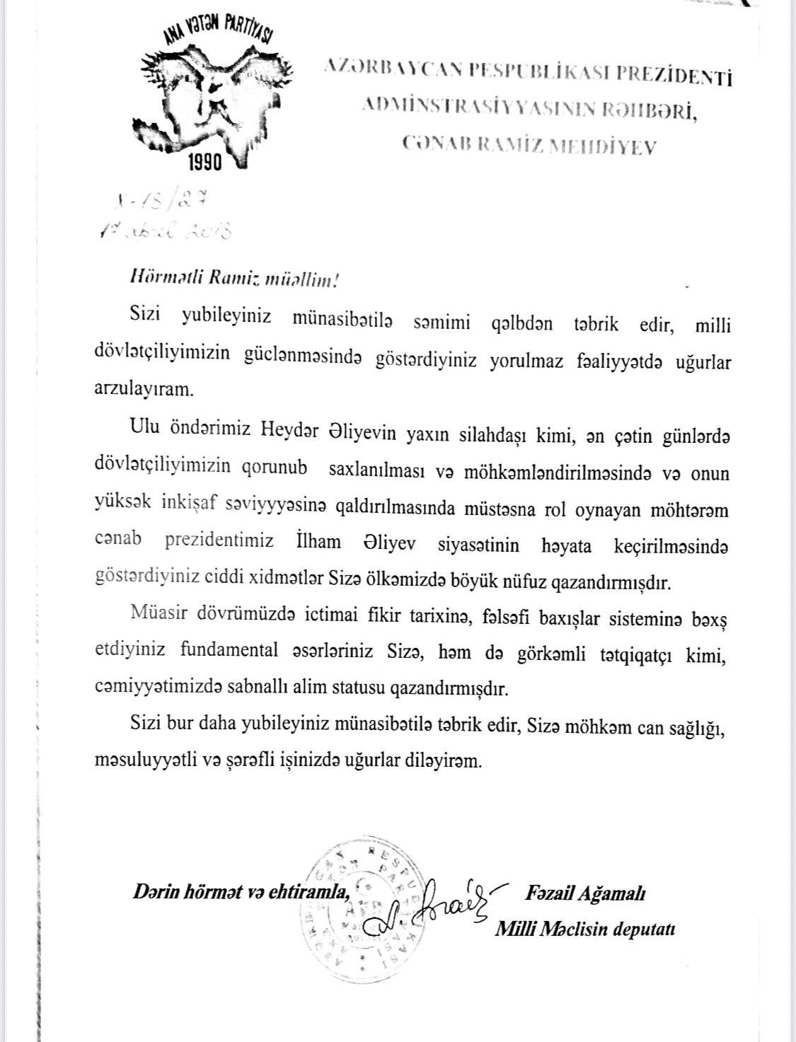 “Hörmətli, Ramiz müəllim, sizi yubileyiniz münasibətilə səmimi qəlbdən təbrik edir, milli dövlətçiliyimizin güclənməsində göstərdiyiniz yorulmaz fəaliyyətdə uğurlar arzulayıram.