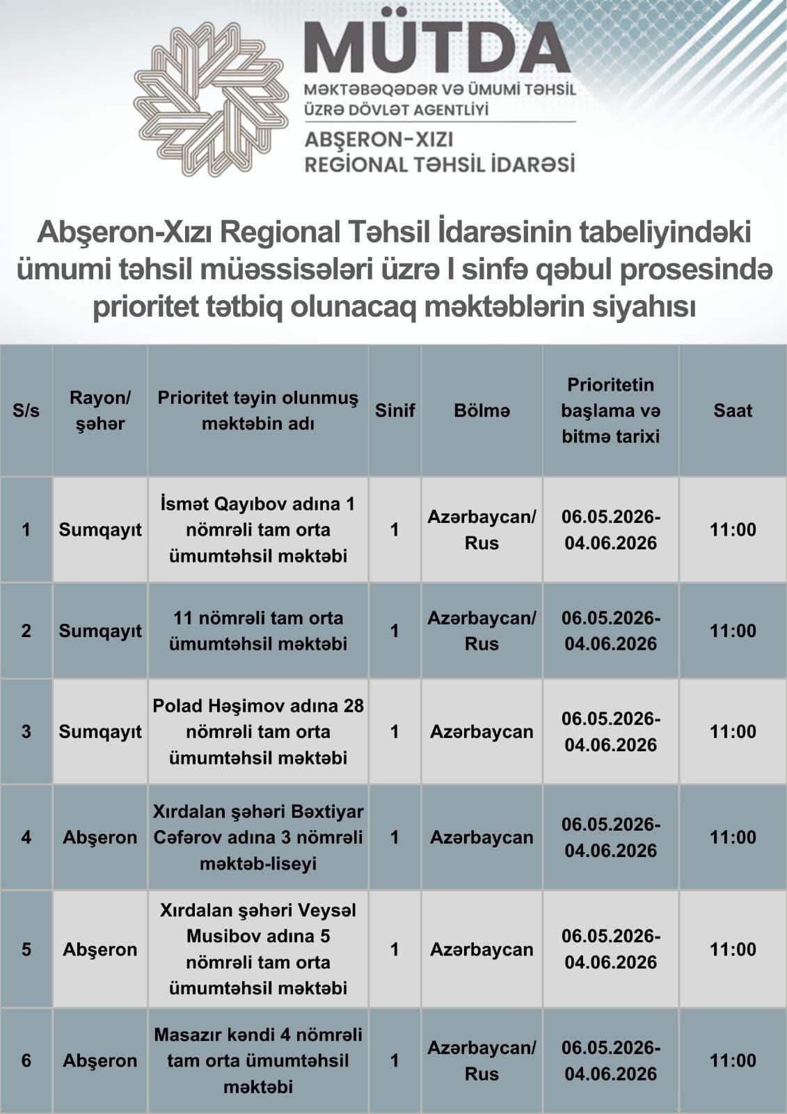 Abşeron-Xızı Regional Təhsil İdarəsinin tabeliyindəki ümumi təhsil müəssisələri üzrə I sinfə qəbul prosesində prioritet tətbiq olunacaq məktəblərin siyahısı açıqlanıb.